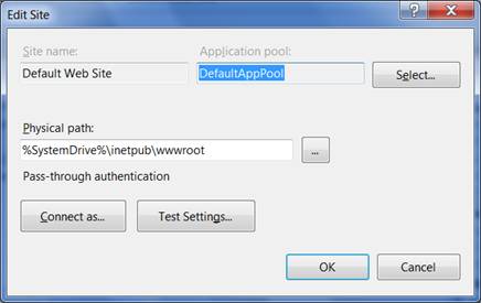6. From the left pane, select the Website and click on Basic Settings link from the Actions area at the right. The resulting dialog will tell us, which Application Pool is being used by this Website (see below):