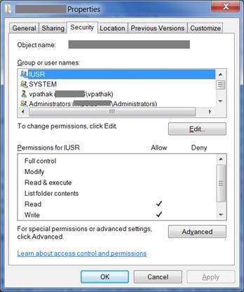 Now that we know, which account is used by IIS for the purpose of impersonation, let’s set WRITE permissions on the correct directory for the User Id used by IIS. Let’s say- we have an ISAPI Extension or a script that creates or updates a file on the local file system. Based on what we know, we need to grant WRITE permission on a folder where our ISAPI Extension will write. Now since, we know the User Id that will be used by IIS for impersonation, let grant write permission to that user, (see below):