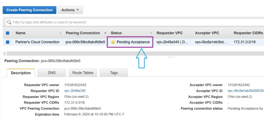 VPC Peering request is initiated by one VPC and accepted by another in order to be enabled. Until Peering request is accepted, the state of the request is marked as ‘Pending Acceptance’.
